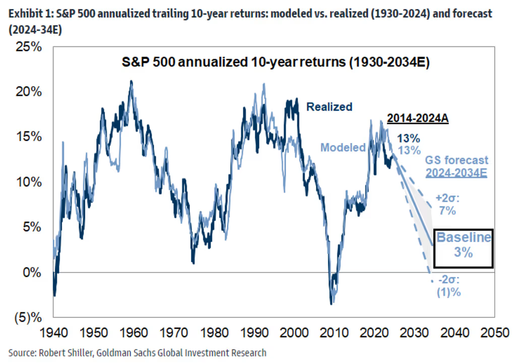 高盛指出,这将比过去10年的平均回报率低10个百分点,根据道琼斯市场数据(Dow Jones Market Data),这也将是1928年至2024年目前为止平均年化回报率的一半左右。