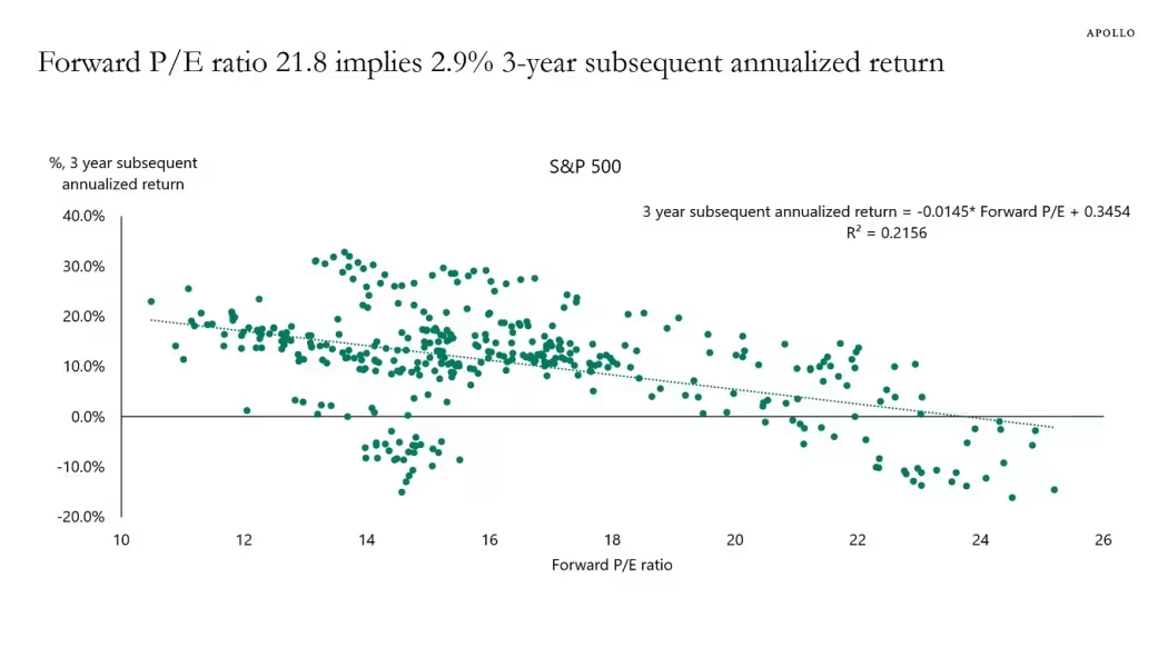 在此之前,摩根大通证券(J.P. Morgan Securities)和投资管理公司GMO的策略师也发出过类似的警告,高盛的这份新报告还谈到了阿波罗全球管理(Apollo Global Management)首席经济学家托尔斯滕·斯洛克(Torsten Slok)强调指出的一些问题,他在一天前发出了类似的警告。斯洛克在报告中强调,从标普500指数目前估值相对于未来12个月预期盈利的水平来看,该指数未来三年的平均年化回报率可能低于3%。
