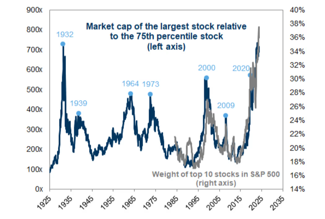 此外,目前美股的集中度已经超过了互联网泡沫时期的水平,达到了20世纪30年代初以来的最高水平。