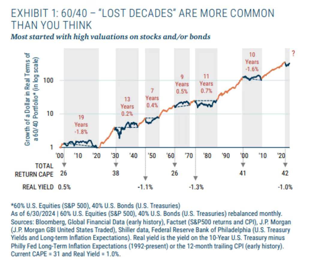 GMO资产配置联席主管本·印克(Ben Inker)列举了1900年以来的六个这样的时期,在这“失去的几十年”里,标普500指数占60%、美国国债占40%的投资组合的实际回报率仅为1%到3%,甚至没有超过通胀。
